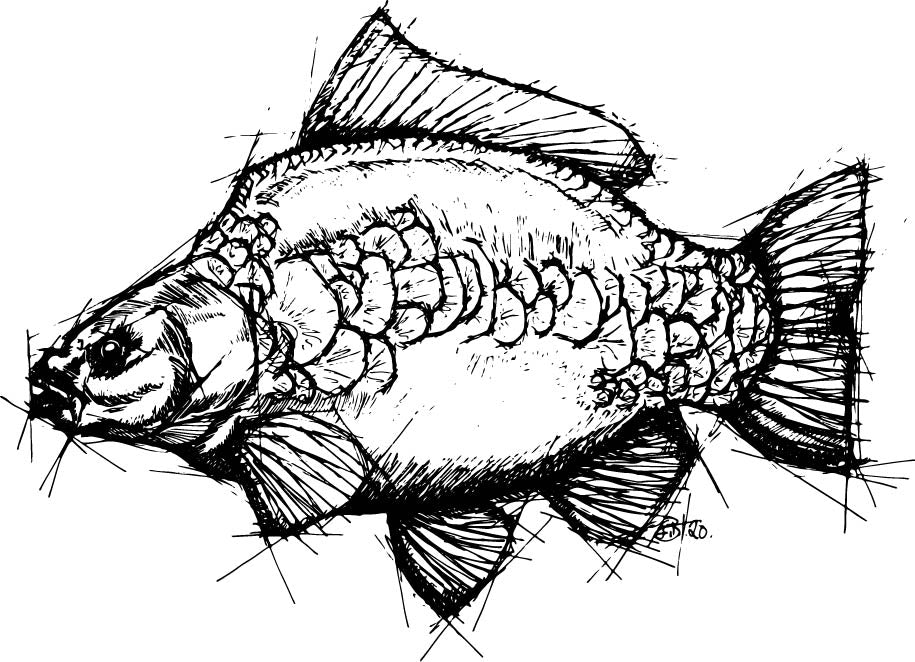 Original hand-drawn illustration of a mirror carp – raw, detailed and bold. Perfect for the carp angler who lives the lifestyle and wants their gear to show it. Stick it on your bait bucket, tackle box, car or bivvy table – wherever your passion lives.