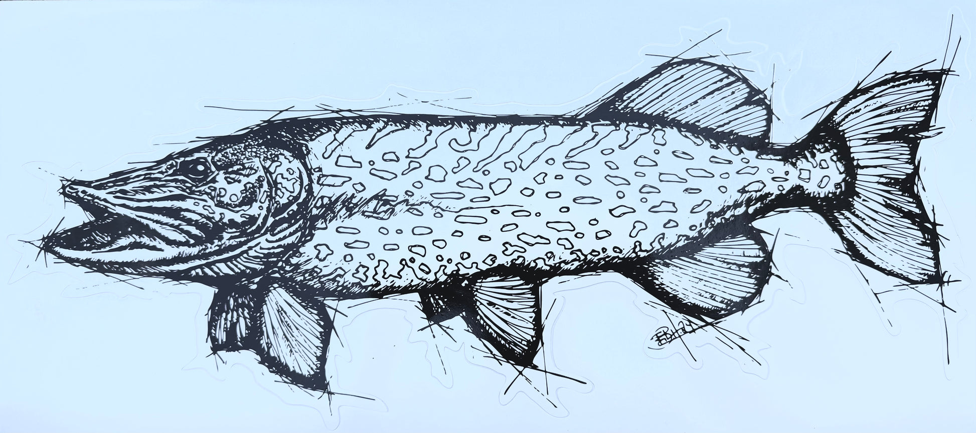 A raw, hand-drawn tribute to the apex predator. This monochrome sketch of a northern pike is printed on ultra-tough vinyl.